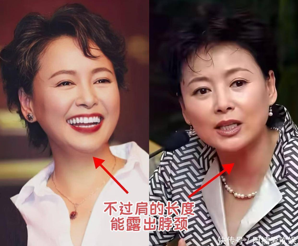 ②头发剪到下巴附近,利落还显瘦在发型的长度上,张瑜更喜欢短发,主要是短发看起来干净利索,打理起来也方便得多,还能露出脖子,对于脸宽、脖子短的中年女性来说,挺友好的一款发型。不过,短发的长度得拿捏准确点,不能太短,以免失去女人味。更推荐的是留到下巴附近的长度,这样的长度几乎适合大部分发腮、方脸的中年女人轻松驾驭。